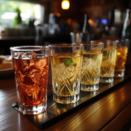 A row of radiant cocktails on a bar, with ambient lighting accentuating the drinks, capturing a festive nightlife atmosphere.