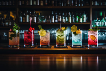 exotic, colorful cocktails arranged on a nightclub counter.The cocktails exude a tropical, refreshing vibe, enticing patrons to indulge in the lively atmosphere of the bar.