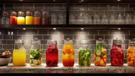 Wellness juice bar in spa with colorful organic juices, citrus water dispensers, and ceramic cups neatly arranged