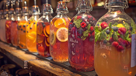 a rack of bottles at a bar that contain different fruits and liquid for kombucha beverages.