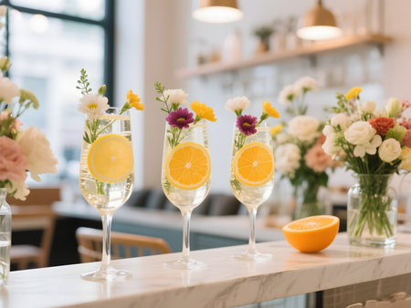 Tall flute glasses with orange citrus cocktails are garnished with edible flowers. The scene is framed with bright spring flowers and a modern interior.