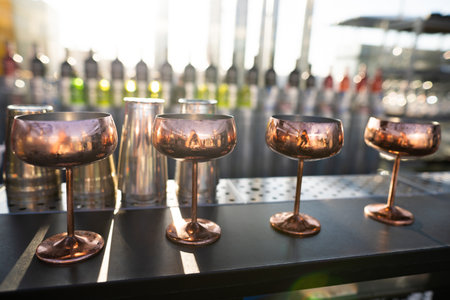 Glasses of champagne on bar counter with barman professional, which making cocktail drinks in background, soft focus