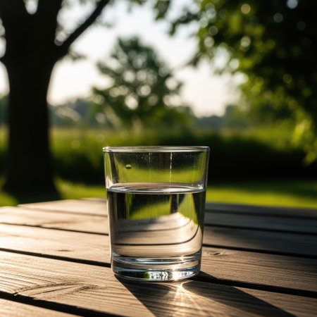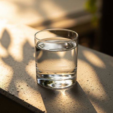 A clear glass filled with pure water, bathed in warm sunlight, casting soft shadows. This image evokes a sense of refreshment and purity, perfect for health and wellness themes.
