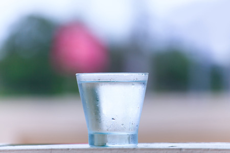A transparent glass glass with drinking mountain water on the background of nature . The concept of drinking mineral water.