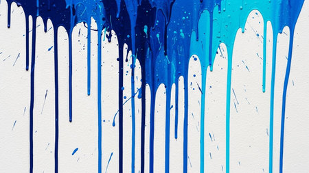 Vibrant blue paint drips and splatters cascade down a textured white surface, creating a dynamic and abstract...