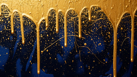 An artistic abstract background featuring gold and deep blue colors with dripping paint and splatter effects creating a dynamic textured visual perfect for creative projects.