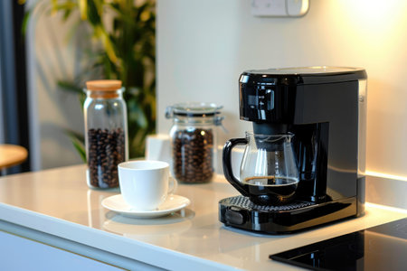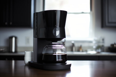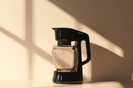 Modern black coffee maker with clear glass carafe showcasing minimalistic design and warmth from natural sunlight for a contemporary kitchen atmosphere