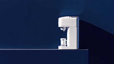 A modern white coffee maker stands on a dark surface, casting a soft shadow, with a glass cup ready for brewing a fresh beverage, embodying contemporary design.