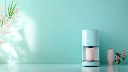 A stylish coffee maker and vase with flowers against a light blue wall, creating a serene and minimalist scene.