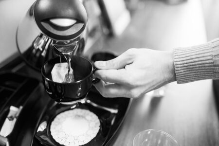 Drip Brew Coffee Caffeine Filter Flavor Mug Cup. Man spills hot water prepare filtered coffee transparent glass drip maker on table