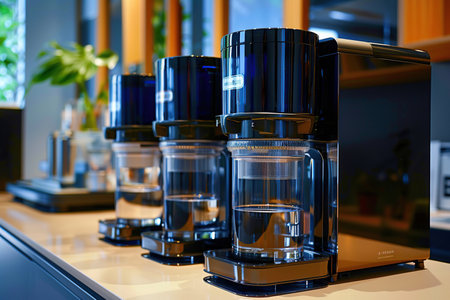 In a bright, sunlit kitchen, a state-of-the-art water purifier hums quietly, its blue light illuminating the bubbling, fresh water. This smart home appliance represents a commitment to health, purity, and modern convenience.