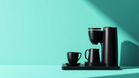 Sleek, modern black coffee machine and kettle paired with matching cups on a teal background