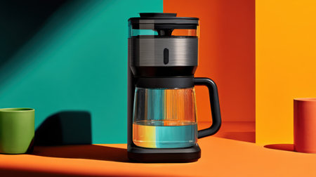 This image features a sleek coffee maker against a bold, colorful backdrop, highlighting its modern design and the joy of brewing coffee at home. Perfect for kitchen themes.