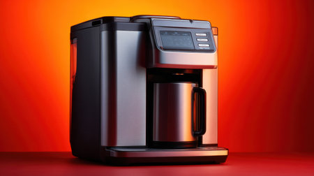 A sleek coffee maker stands on a vibrant orange backdrop, showcasing its modern design and glass components, perfect for contemporary kitchen setups and brewing delicious drinks.