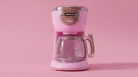 A trendy pink coffee maker featuring a glass carafe stands out against a soft pink background. Perfect for adding charm to any kitchen or coffee nook.