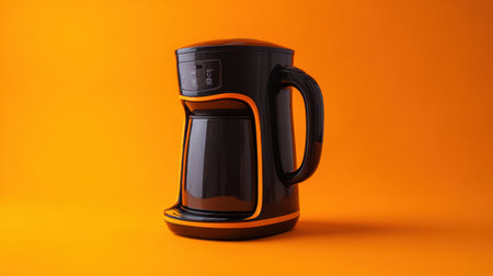This sleek black coffee maker stands prominently against a vibrant orange backdrop, showcasing its modern design. Ideal for coffee enthusiasts and stylish kitchens.