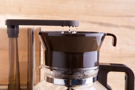Black coffee maker to prepare American coffee with glass jug with reusable filter to put ground coffee and obtain the infusion preparing breakfast in the kitchen