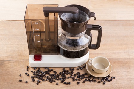 Traditional drip coffee, using white cotton to put coffee and a glass jug for falling hot coffee. Traditional drip coffee of native people in the coffee shop of the village.