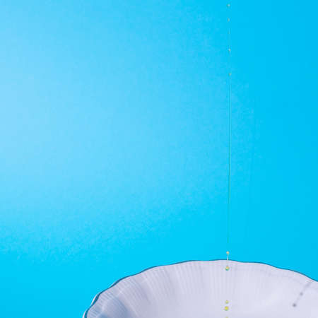 White plate. Oil dripping on a plate. Blue background. Text space. Cooking, fresh, organic, raw, oil, concept. Minimal style.
