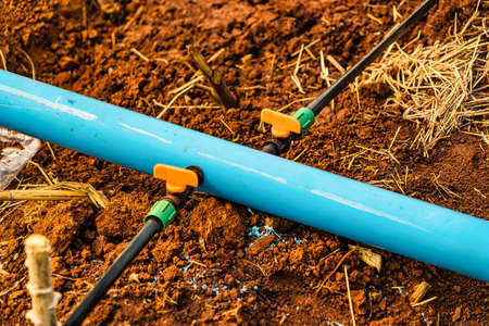 Drip irrigation system assemble in agriculture field. rural scene.