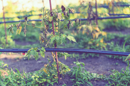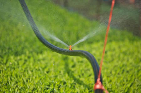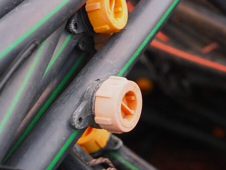 Drip Irrigation System Close Up. Water saving drip irrigation system being used in farm.