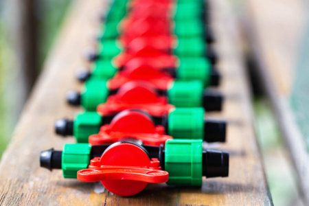 Multicolored plastic taps for assembling drip irrigation at the dacha