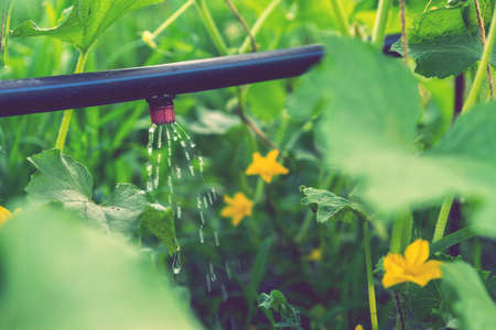 Cucumber growing in garden. Drip auto-irrigation of cucumbers. Growing vegetables in the garden bed. Gardening farming. Industry is a glass house. Organic green leaves. toned.