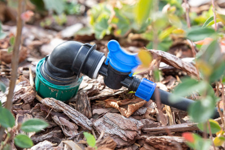 Close-up of a drip irrigation system connector with a blue control valve, surrounded by wood mulch, integrated into a garden bed for efficient watering.