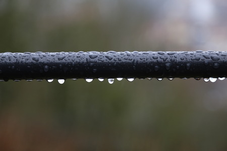 Dew drops on black steel rod on green background