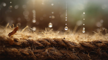 Soft rain falling gently on Coir, with water droplets forming and slowly dripping. The background is softly blurred with a natural, moody atmosphere.