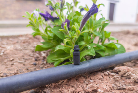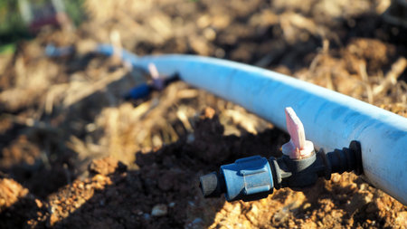 Close-up of drip irrigation system efficiently watering dry soil, ensuring precise hydration for plants in a garden setting