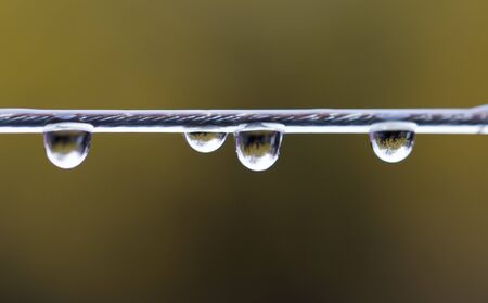 Drops of water cling to the top of the grass or tree branch. Raindrops on the top of the leaf. nature after rain