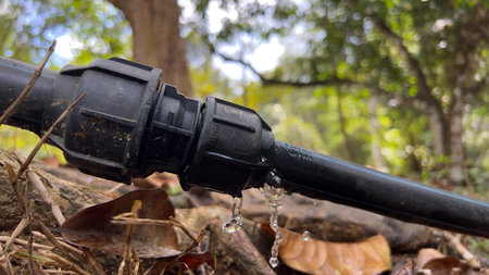 Close-up of black plastic pipe connector leaking water outdoors, surrounded by soil, leaves, and rocks.