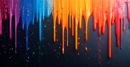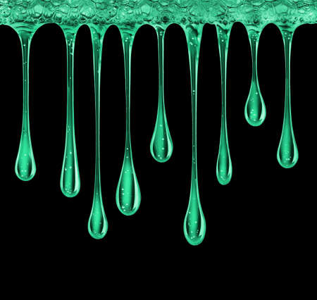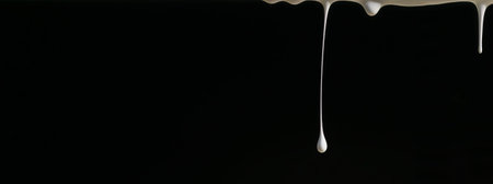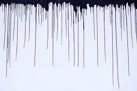 Thick black liquid drips in uneven strands from a horizontal line onto a rough, textured background. Abstract and moody.