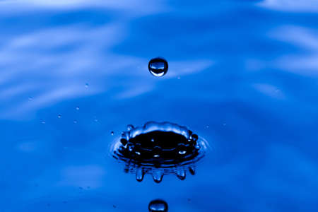 Dark blue water droplets splashed closely on the water surface. It creates a water wave and a perfect crown.