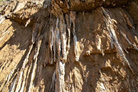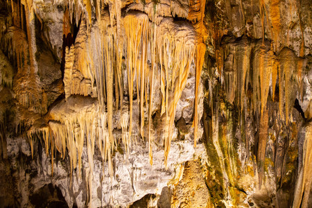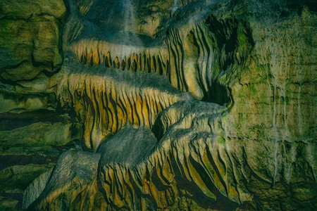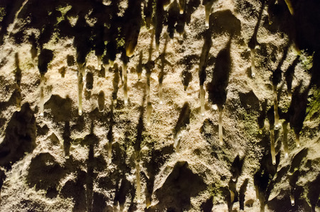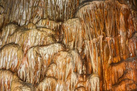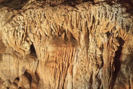 Cave texture background with Stalactite and Stalagmite Formations in the Dim Cave in Alanya, Turkey
