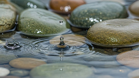 An overhead view displays water droplets creating ripples on a reflective surface, surrounded by smooth, multicolored stones. The image captures the interaction of water and the stone environment, showcasing different textures and colors. This photograph may be suitable for illustrative or decorative uses, emphasizing natural elements and clean aesthetics.