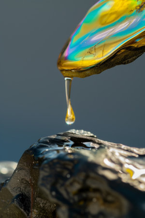 A captivating close-up image showcasing a blue liquid droplet dripping from a textured rock surface, surrounded by reflective water. Perfect for nature and abstract themes.