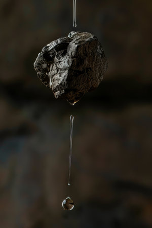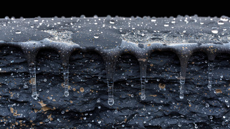Globs of a dense black substance drip from a rough gray surface against a contrasting background showcasing fluid dynamics and texture.