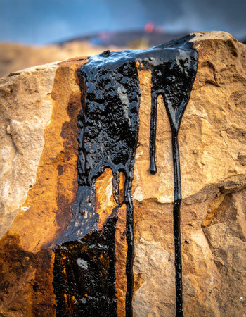 A thick, black stream of crude oil slowly seeps from a fissure in a sedimentary rock, a stark visual representation of fossil fuels, natural resources, and the environmental impact of their extractio.