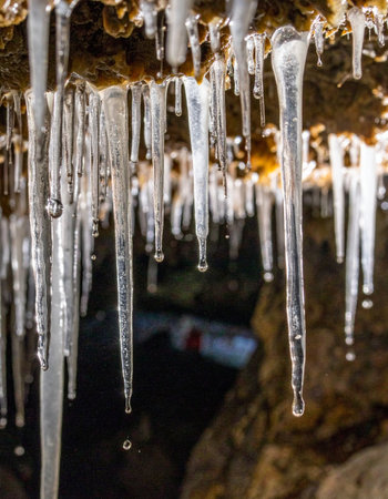 A close-up view captures the delicate beauty of icicles slowly melting at the entrance of a dark, mysterious cave. Each droplet of water signifies the transition from the deep freeze of winter to the gentle thaw of spring, a quiet and natural cycle in motion.