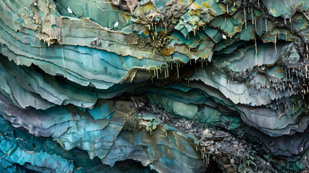 This breathtaking image captures the ethereal beauty of a cliffside cavern with layers of vibrant blue and green rock formations carved by the relentless forces of nature Nestled within this