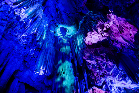 Subterranean pictures of Stalagmites and stalactites in different shapes and colors throughout tunnels, caverns and large halls, Remouchamps, Belgium