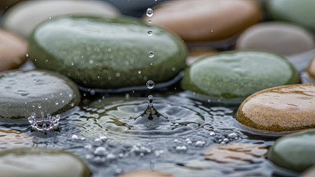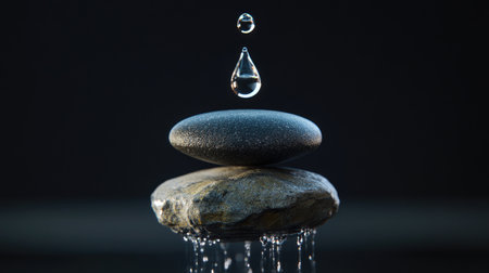 This captivating still life image features smooth stones with droplets of water, symbolizing tranquility and balance, ideal for wellness and spa themes.