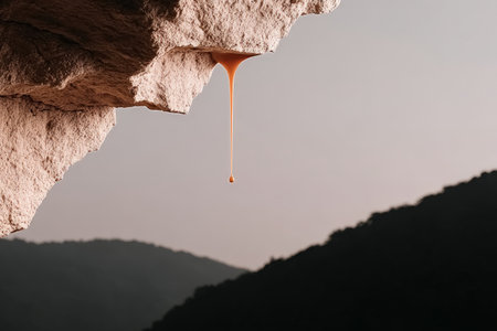 Honey dripping from rocky cliff in mountain landscape at sunset.
