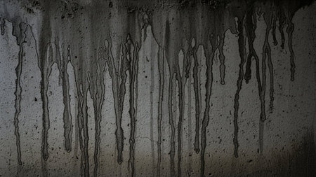 A close-up view of a weathered concrete wall with prominent dark vertical streaks and a rough, textured surface.
