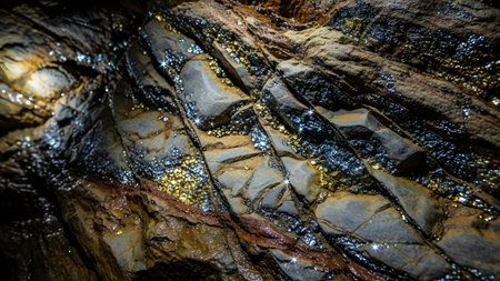 A close-up view of a rich gold ore vein embedded in dark rock, glittering with metallic light. The detailed texture of the stone and precious metal highlights the concepts of mining, geology, and natural wealth.