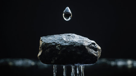 A striking visual of a black stone featuring a delicate water droplet poised above it against a dark background, evoking peace and connection with nature.