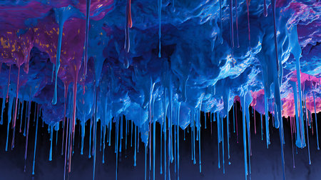 A close-up view of blue paint dripping down a textured wall creates a compelling artistic effect. The interplay of light and shadow adds depth and intrigue.