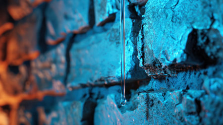 A captivating close-up image showcasing a single water droplet hanging from a textured brick wall. The interplay of blue and orange lighting enhances the visual appeal, creating an artistic atmosphere.